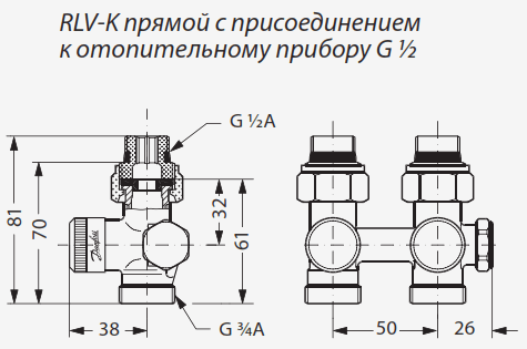 ческого обслуживания без опорожнения всей системы отопления. Для дренажа отдельного отопительного прибора на клапан Danfoss RLV-K (003L0280) надевается специальный спускной кран. Клапаны изготавливаются из латуни с никелевым покрытием в прямом и угловом исполнении.С помощью специальных переходников может присоединяться к штуцерам отопительного прибора с внутренней резьбой G ½ или наружной резьбой G ¾ A. Переходники являются само уплотняющи мися. Поставляются с завода настроенные для применения в двухтруб ной системе отопления. Переключение клапана для работы в однотрубной системе производится простым враще нием затвора байпаса.