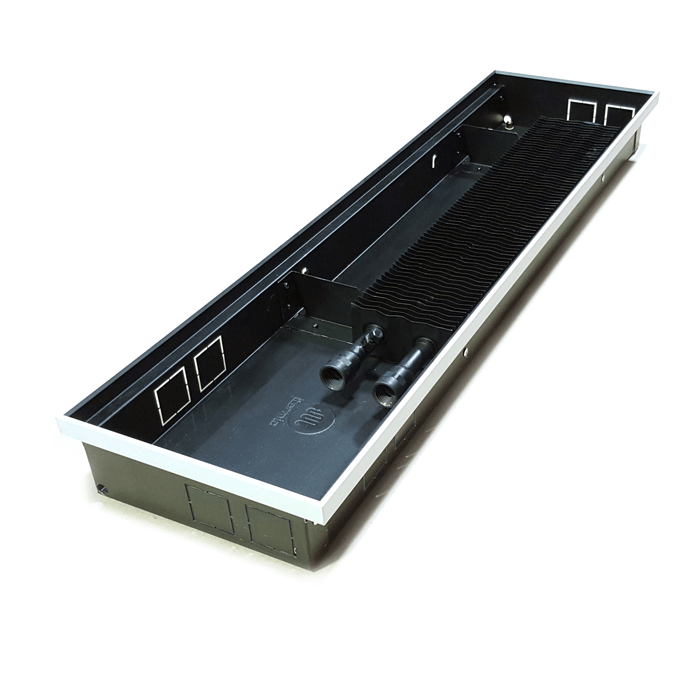 Выгодно отличаются от других встраиваемых конвекторов своей универсальностью, а именно возможностью установки в них вентиляторов для изменения типа конвекции с естественной на принудительную. Для этого в конструкции короба предусмотрены все соответствующие детали, а теплообменник смещен к краю освобождая место для вентиляторов.